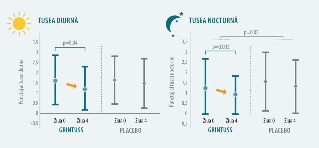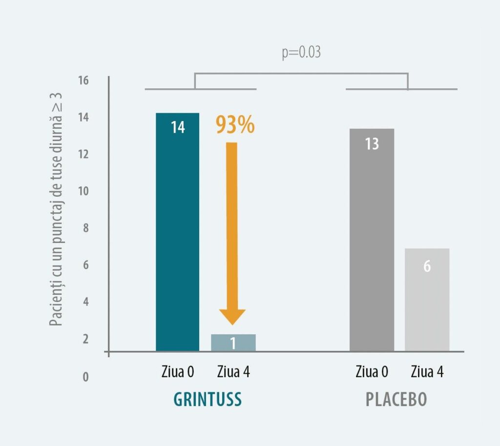 Într-un studiu clinic controlat cu placebo (Canciani et al. 2014)1, efectuat pe 102 copii (3-6 ani) care au avut o tuse acută și persistentă de mai mult de 7 zile, Grintuss Pediatric a ameliorat semnificativ: